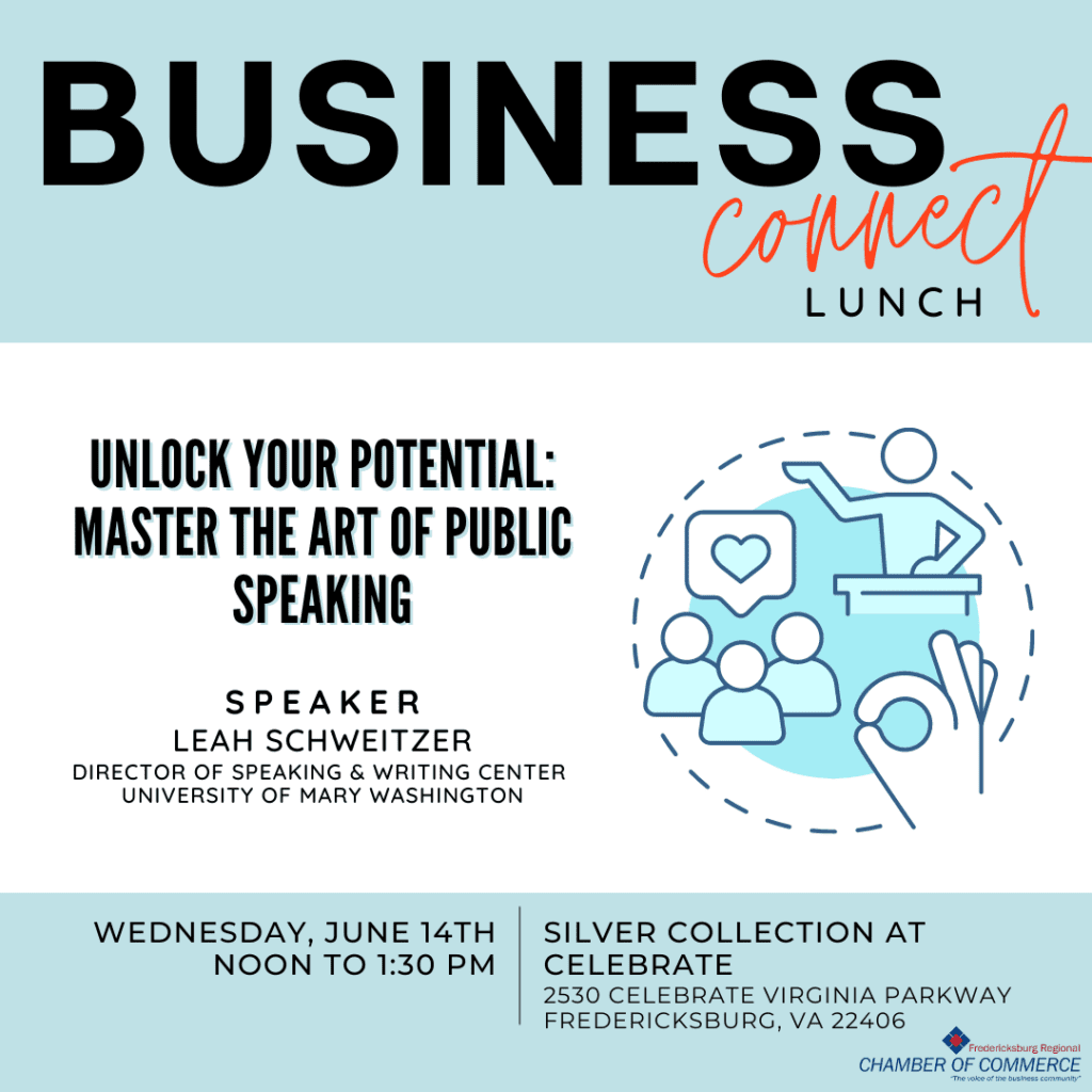 Connect with fellow Chamber members at our monthly luncheon! This month’s topic is The Business of Public Speaking with Leah Schweitzer, Director of Speaking & Writing at the University of Mary Washington