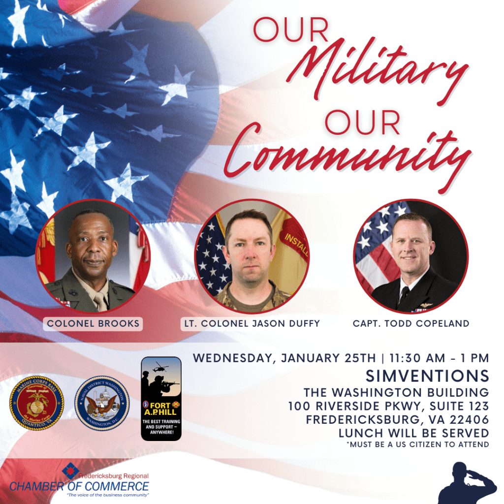 The first meeting of the New Year will feature community and military updates from our 3 local bases, Fort AP Hill, Quantico, and Dahlgren.