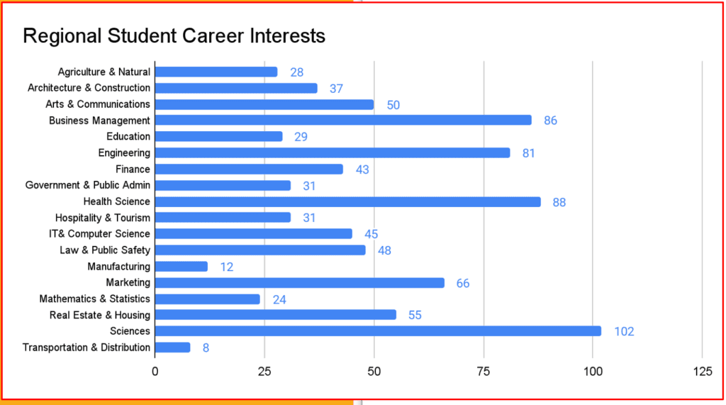 - Jobs attracted the most interest from students in Business & Management, Health Sciences, Agriculture & Food & Natural Resources, and Arts & Communications.