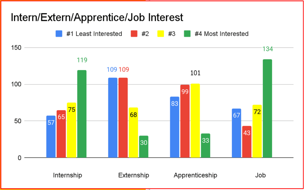- Internships were popular in Business & Management, Health Sciences, Arts & Communication, Architecture & Construction, and among Trade interests.